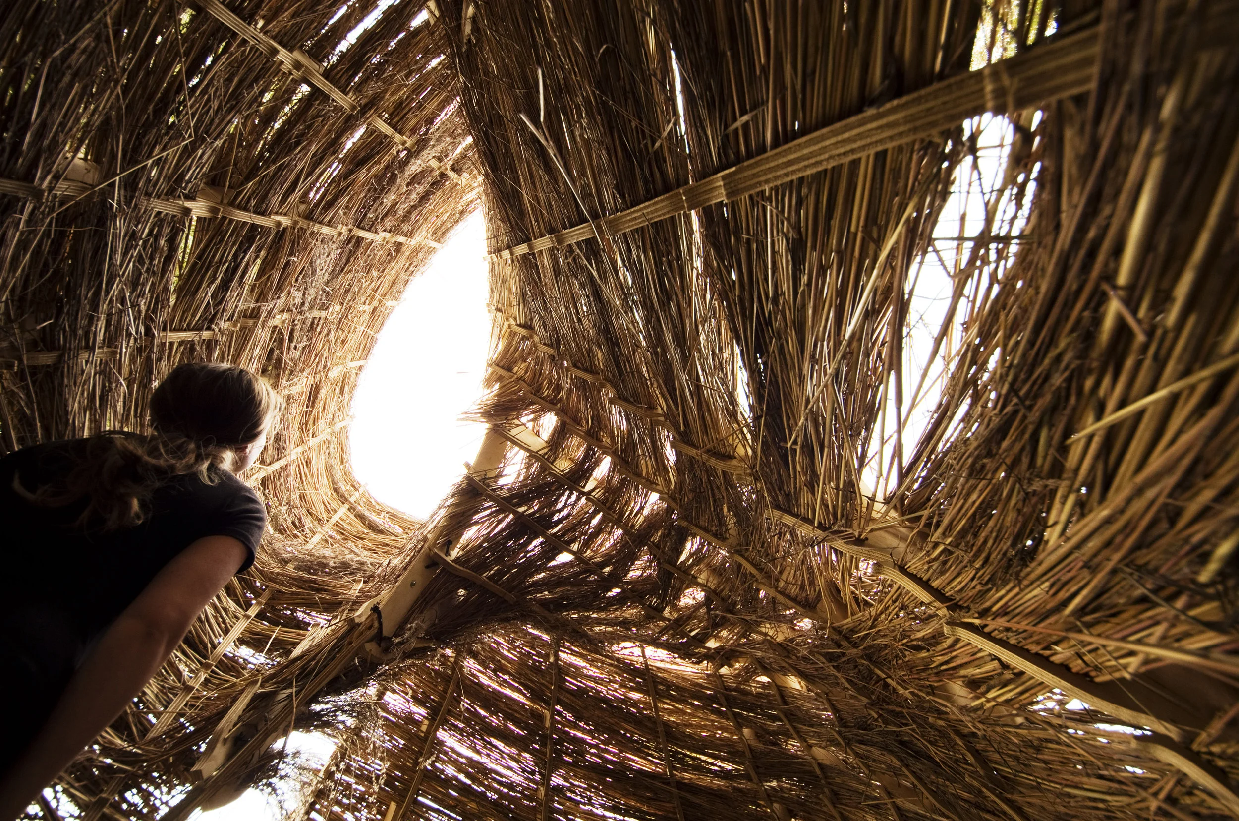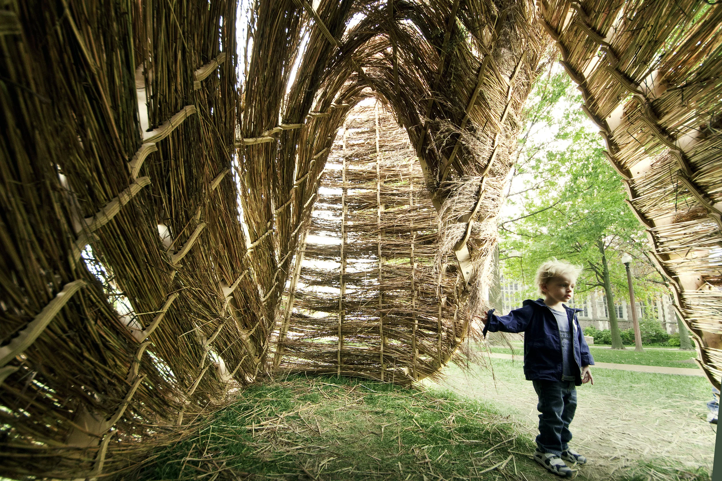The Gleaned Sukkah is a temporal assembly that is constructed for use during a week-long festival of Sukkot. The tectonic, material and assembly are developed through understanding the context of this cultural ritual. The Gleaned Sukkah synthesizes cultural rituals with natural cycles. The tectonic negotiates two distinct material systems, one which loosely controls the other. A tenuous composite of precisely fabricated, lacy frame delicately pinches the tufts of long, native prairie grasses to form a reciprocal structural system.